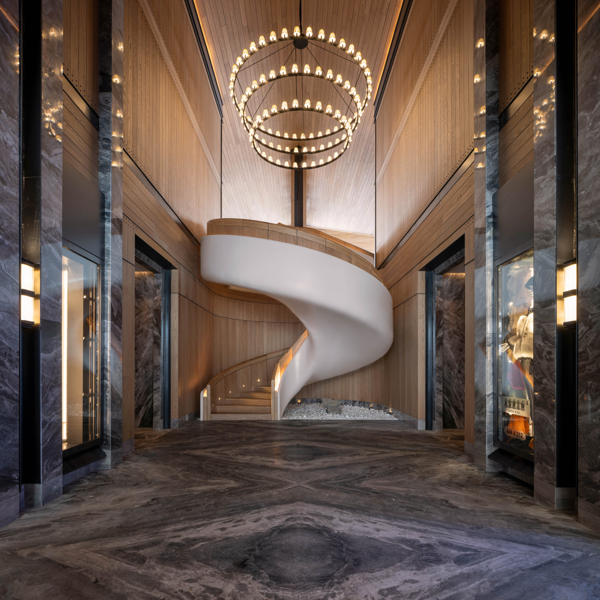 The lounge floor, which can be accessed via a sculptural staircase at the entrance of the parking level when the floors close at 5 p.m. and transforms into a large party area after dinner, offers guests a visual architectural experience with its unique and sophisticated design.