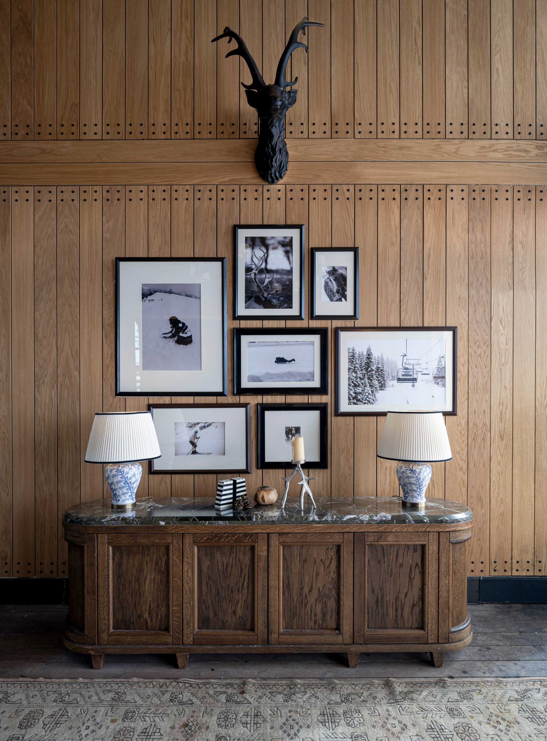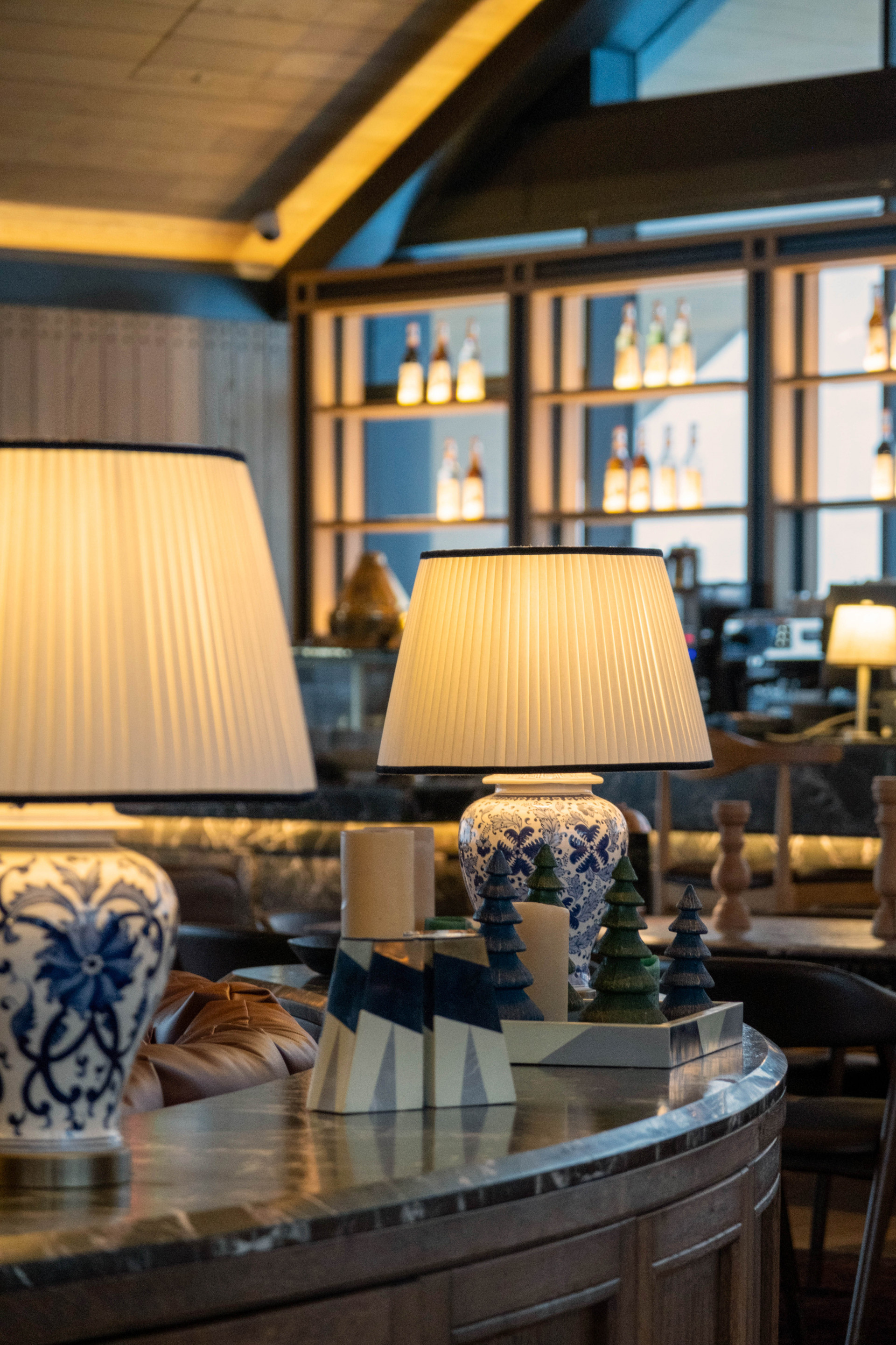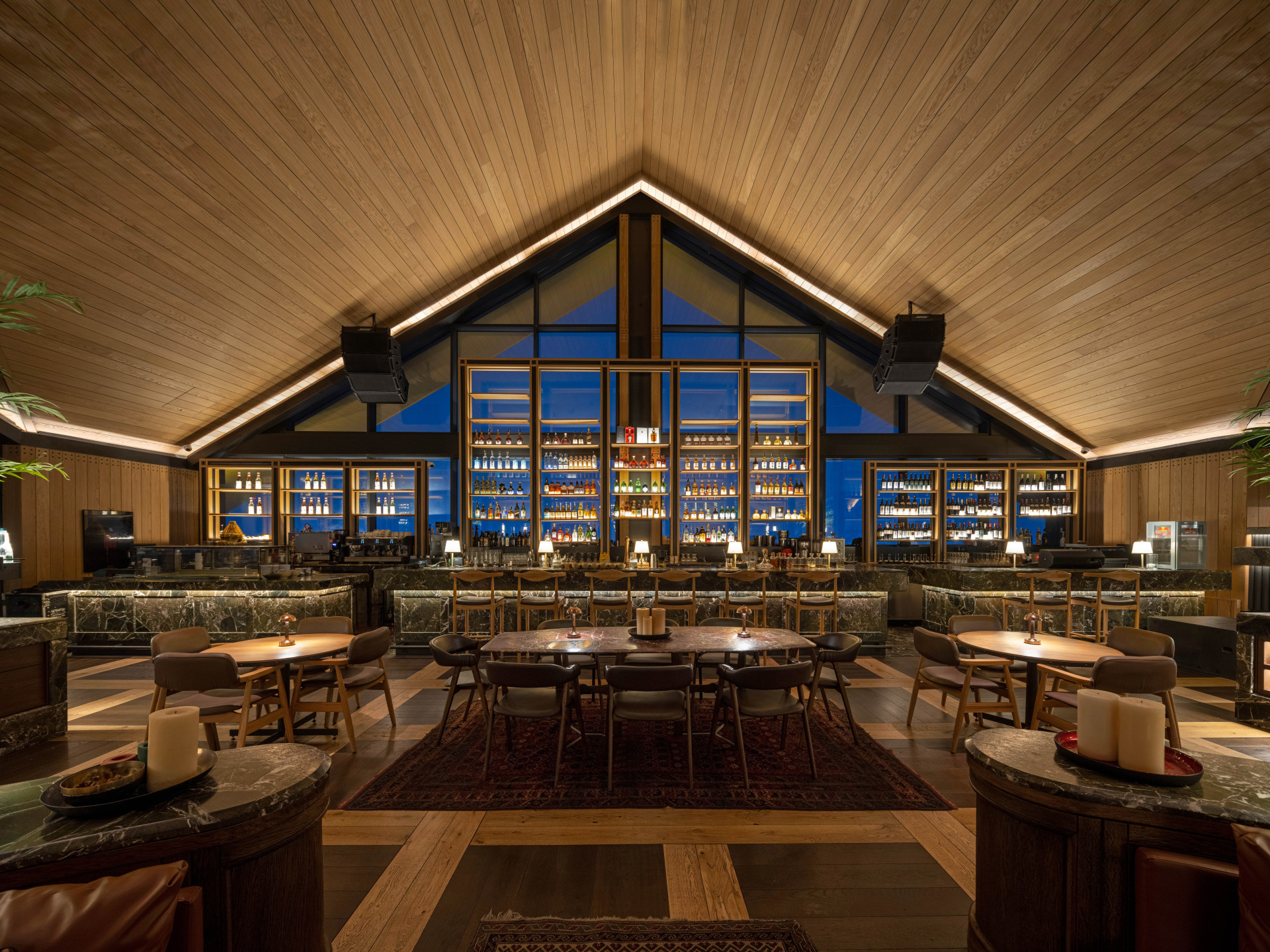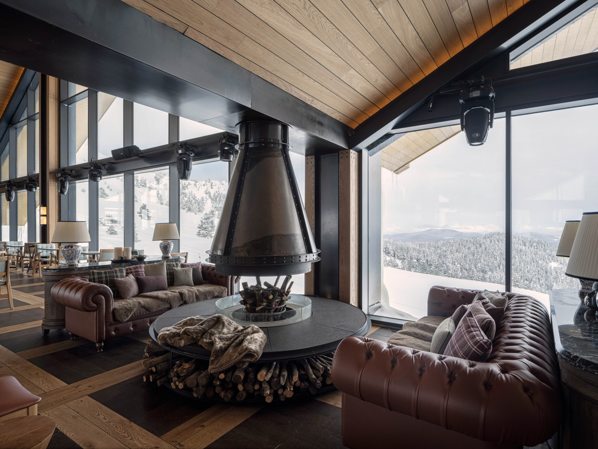 With a ceiling height of 8.5 meters and an architectural design in the form of a hipped roof, the hotel is reminiscent of a mountain lodge and, with its ski slopes accessible during the day from the lounge floor, offers a unique service for those who do not want to give up winter sports. The natural black foil structure of the wood paneling made of oak on the walls and the use of parquet in the form of a weave of the same tree on the floor stand out from among the decorative items. The 2.8-meter canopies, which extend from the inside to the outside and are wrapped with hidden spotlights, contribute to the illumination of all facades and stand out with their structure that emphasise the integrity of the building.