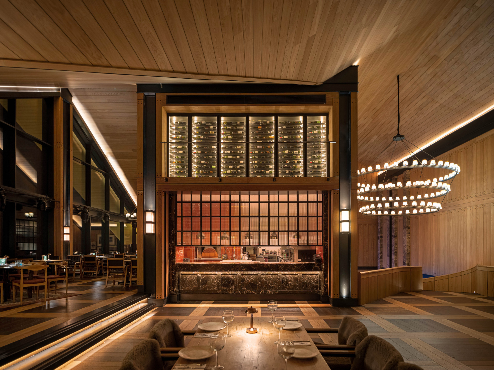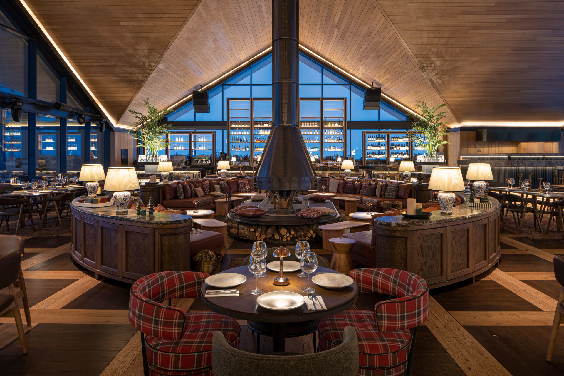 With a total enclosed area of 3.800 square meters, the first floor of the two-story building houses private dining rooms as well as technical spaces such as staff quarters, preparation kitchens, and a garage while the lounge area that welcomes guests on the upper floor houses four different restaurants: Develi, Serafina, Inari, and Palazzo Steakhouse.